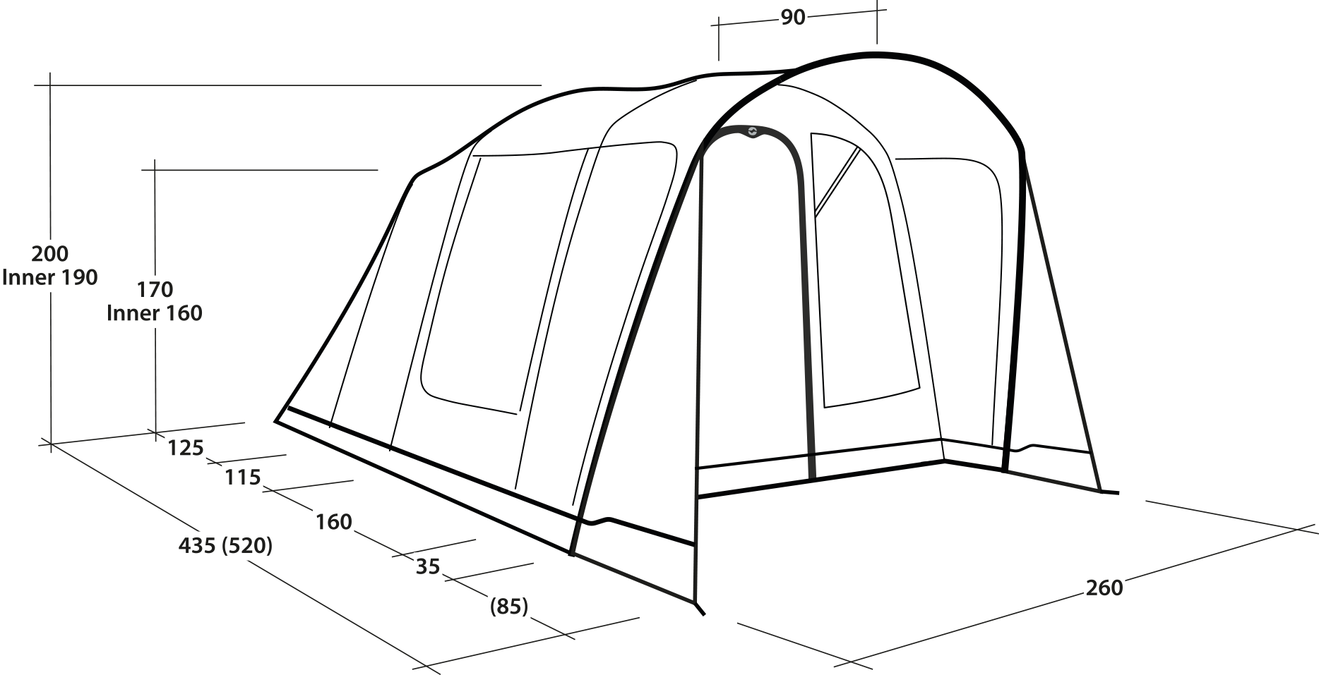 Type de tente: tente tunnel à trois espaces